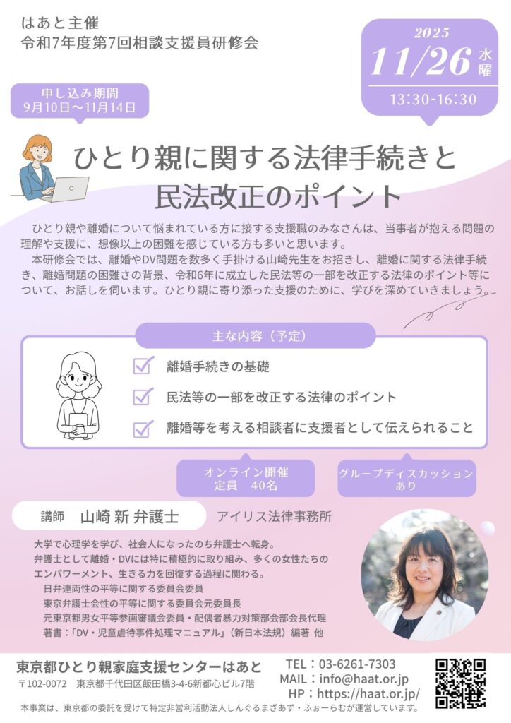 はあと主催 令和7年度 第7回相談支援員研修会 ひとり親に関する法律手続きと民法改正のポイント