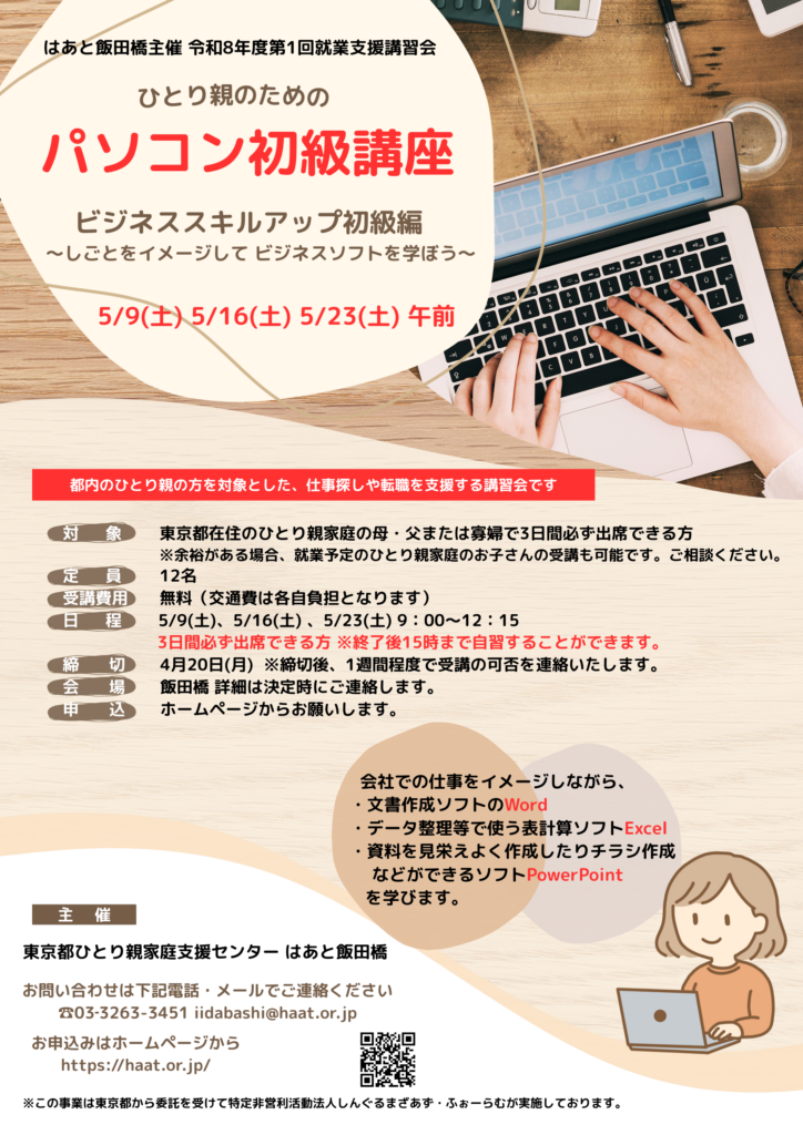 はあと飯田橋主催 令和8年度 第1回就業支援講習会  パソコン講座 ビジネススキルアップ《初級編》~しごとをイメージして ビジネスソフトを学ぼう~