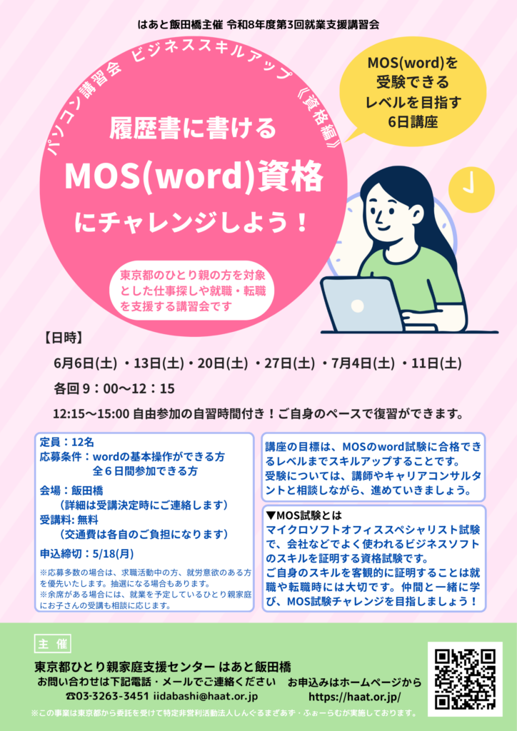 | 応募条件 | wordの基本操作ができる方 全6回参加できる方 都内在住ひとり親の方 |